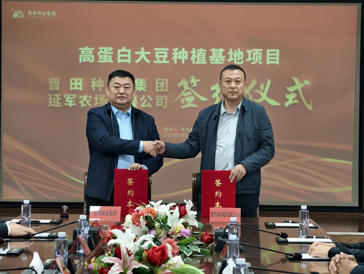 5月23日,普田种业集团与延军农场有限公司就高蛋白大豆种植基地项目成功签署合作协议。延军农场有限公司农业副场长陈斌斌,农业发展部部长白洪波,跃进河管理区主任娄起兴,农服副主任吕德旭,垦丰种业经理曾莹莅临普田种业集团。普田种业集团董事长吕守义,总经理王海涛,财务总监王中飞、行政总监屈洪艳、综合事业部部长盖世杰、大豆事业部部长周杨等集团高管出席签约仪式。