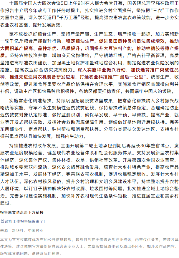 深入实施种业振兴行动!李强总理作政府工作报告
