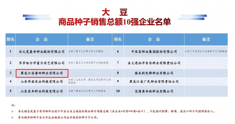 9月27日,第十七届中国国 际种业博览会暨第二十二届全 国种子信息交流与产品交易会发布权威数据:黑龙江省普田种业有限公司2024年度大豆商品种子销售总额跻身第三,常规水稻商品种子销售总额位列第七。这一排名展现了公司沃豆®、北粳®系列品种为粮食增产、农民增收所提供坚实的品种支撑。普田种业将持续强化科技创新核心引擎作用,为绘就中国种业繁荣兴盛、支撑农业强国建设的壮丽蓝图贡献普田智慧和力量!