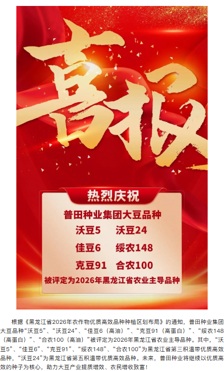 喜报 | 普田种业集团6个大豆优质高 效品种被评定为2026年黑龙江省农业主导品种
