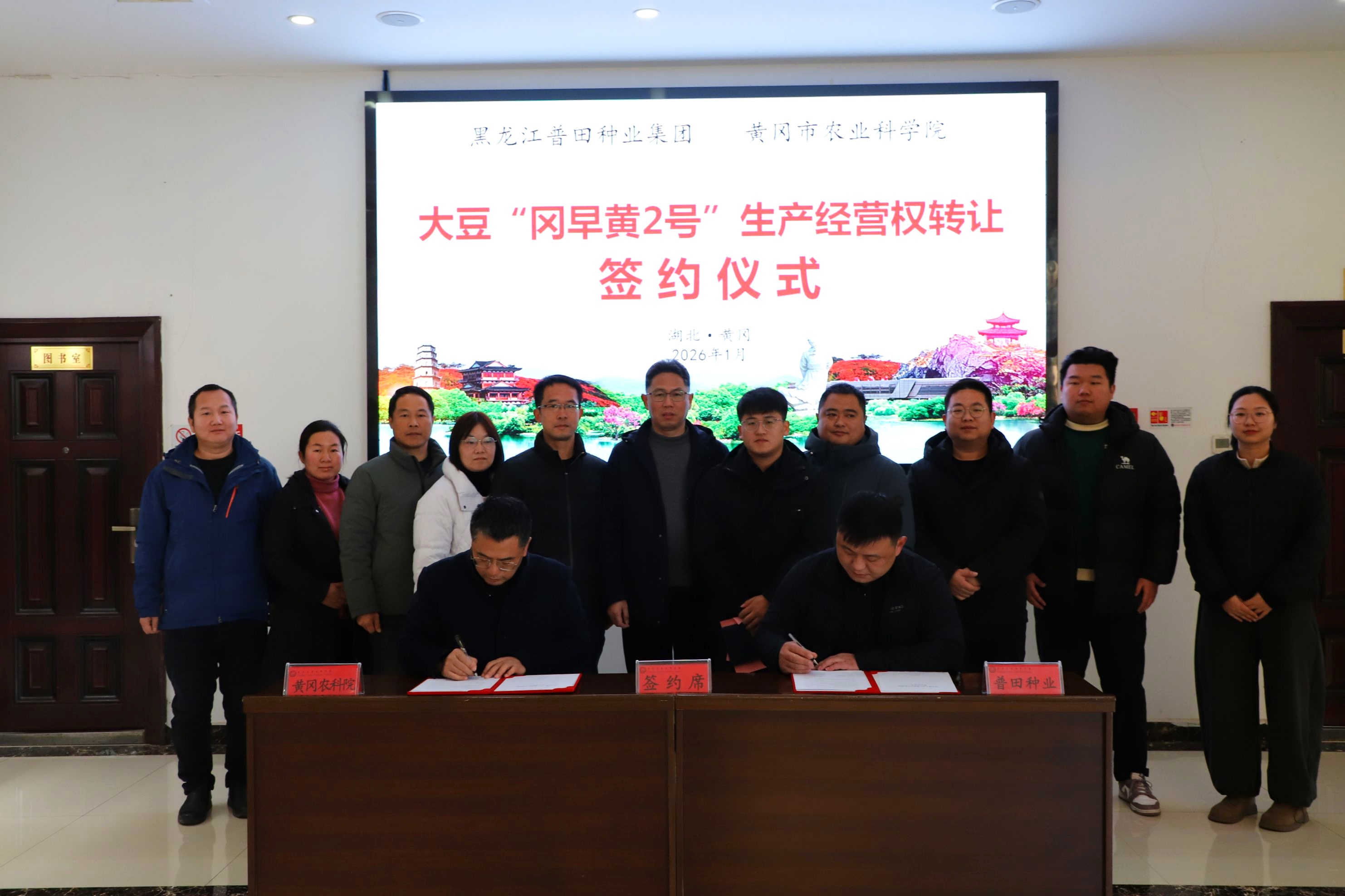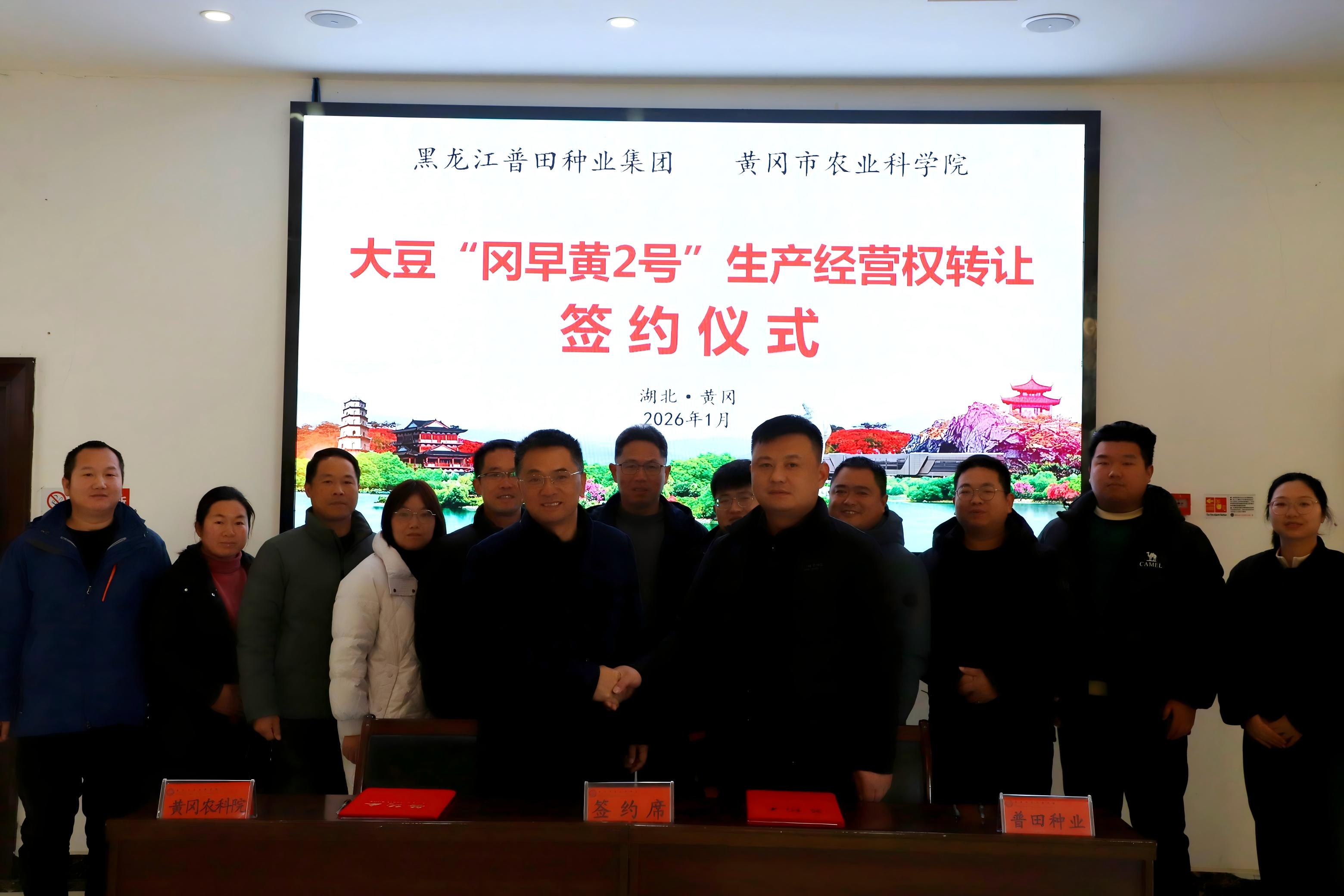 2026年1月8日,普田种业集团与湖北省黄冈市农业科学院举行大豆新品种“冈早黄2号”合作签约仪式。黄冈市农业科学院院长涂军明,党委副书记张晓能,党委委员、副院长缪志锋,普田种业集团黄淮海经营事业部部长王攀,以及双方相关部门负责人与专家共同出席活动。