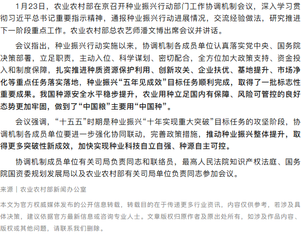 农业农村部召开种业振兴行动部门工作协调机制会议